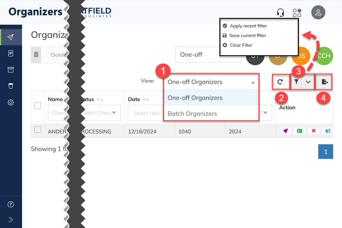 - Click the View drop-down to display One-Off or Batch organizers.