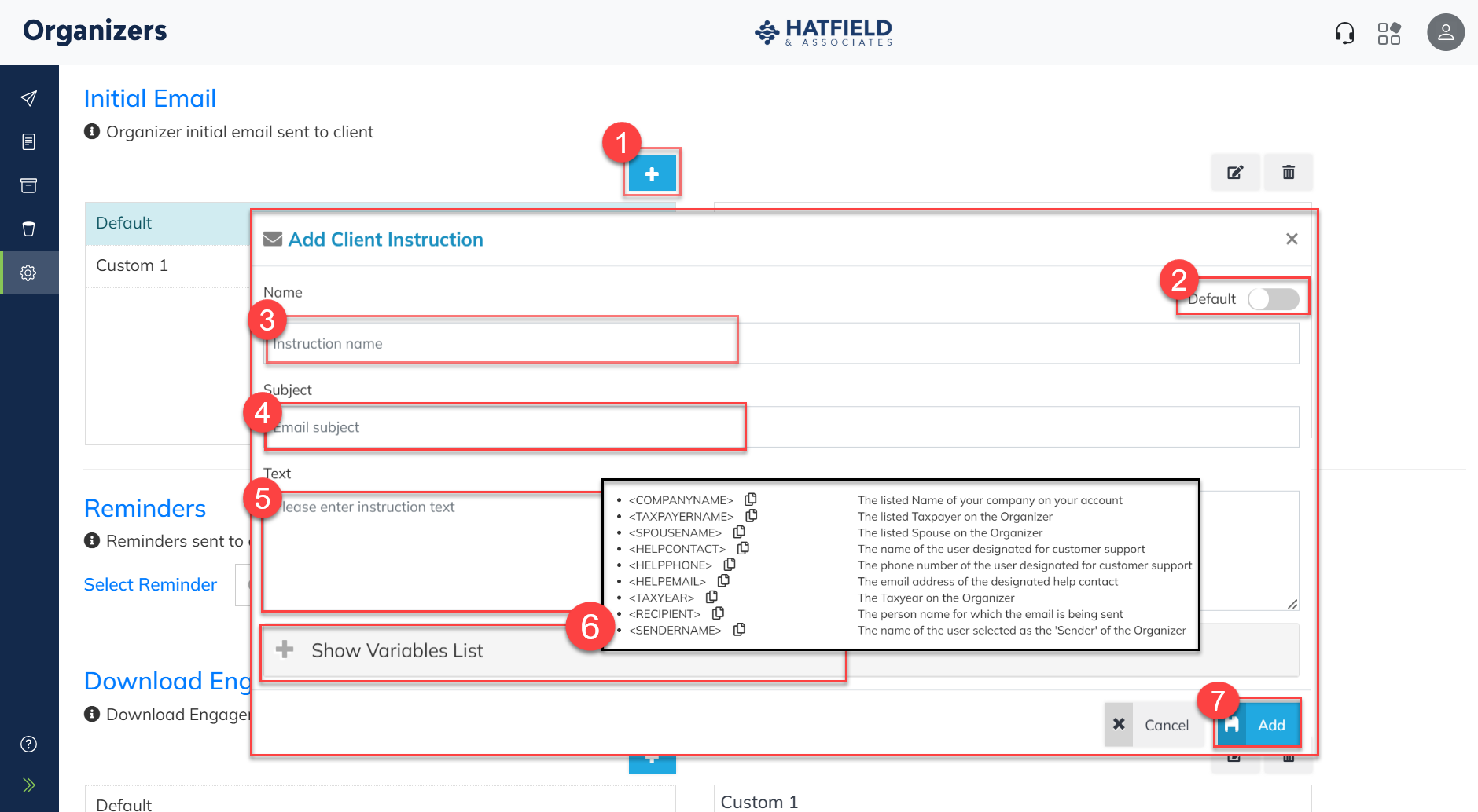 - Click Variable List to see bracketed variables that users can add to the Subject or Text to personalize the message, such as <TaxpayerName>, that will be auto-filled.