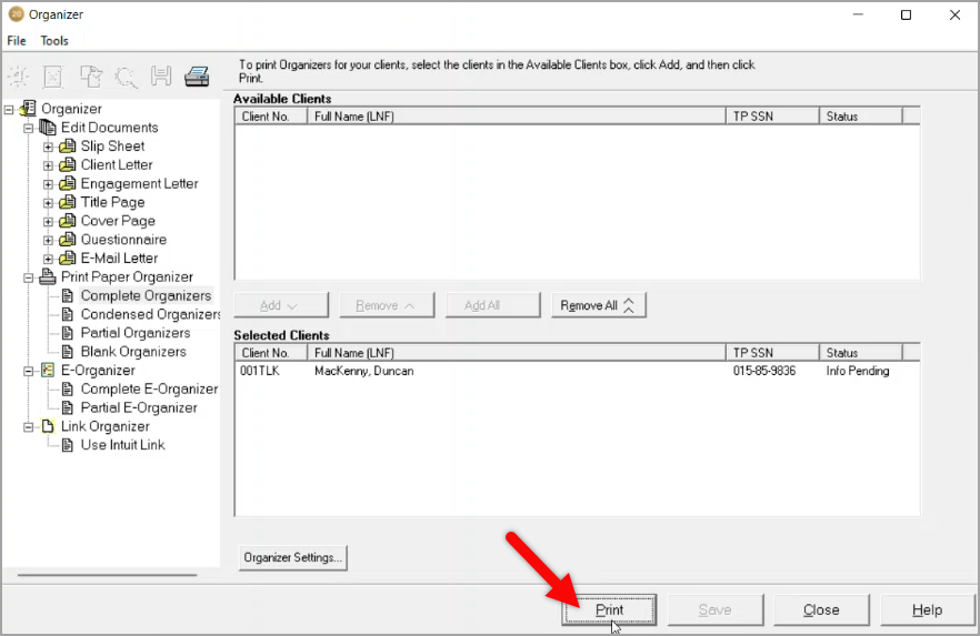 - (Optional) If printing to a batch, change the filename to match the format Organizer Forms - <Client ID>.